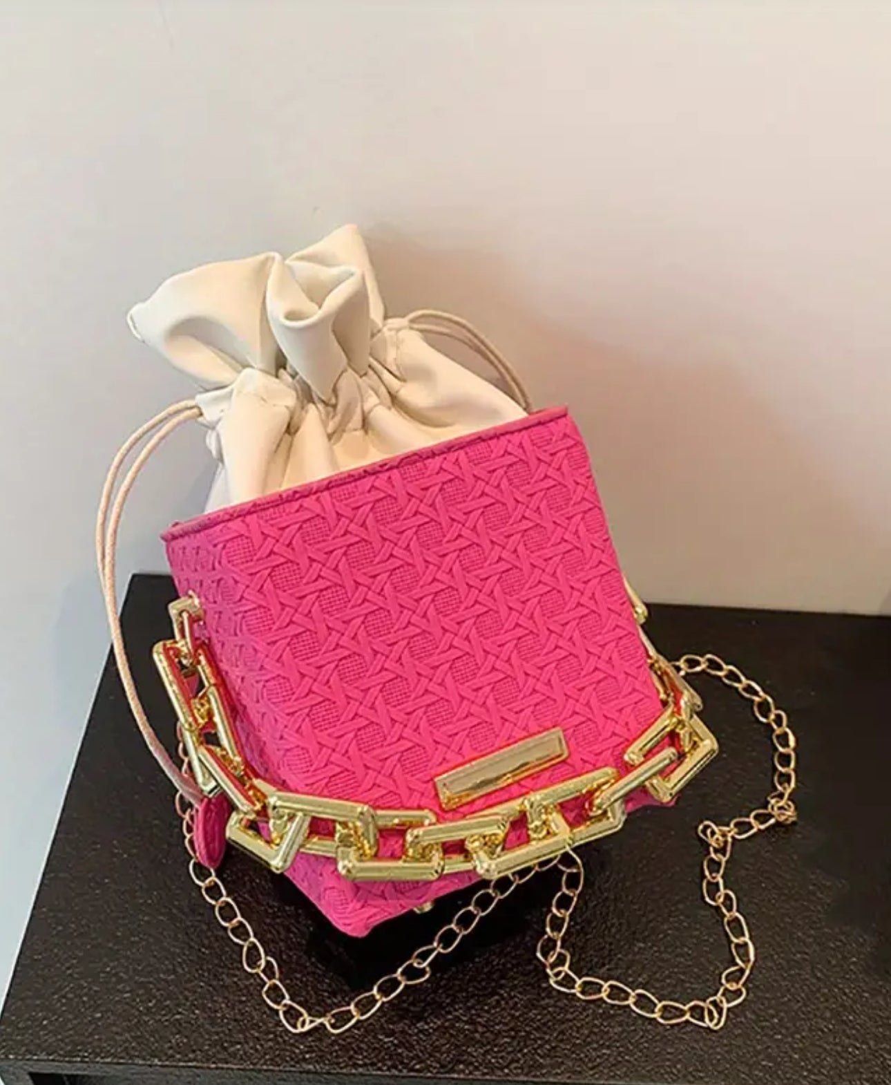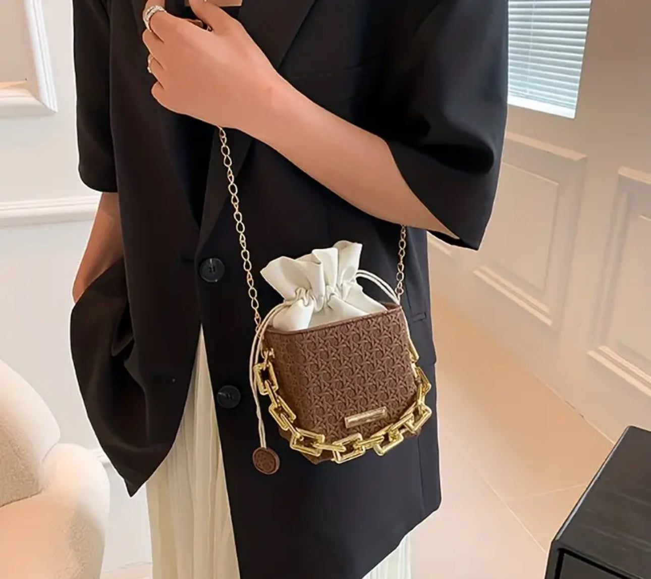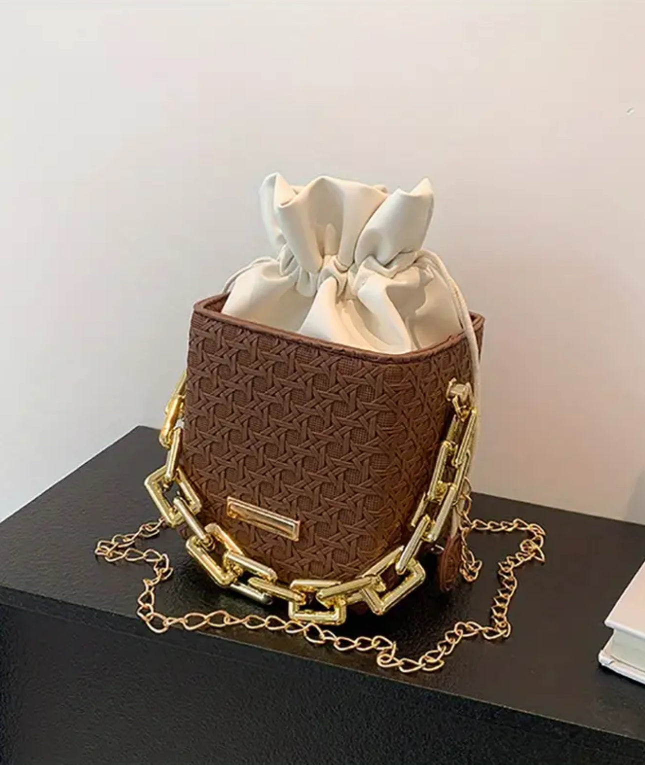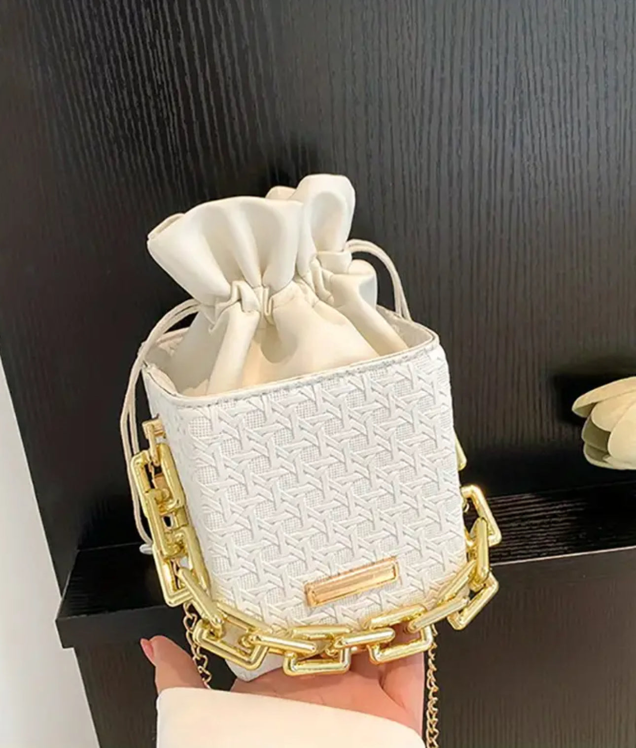 Crossbody Bucket Bag with Chain Strap and Drawstring Closure