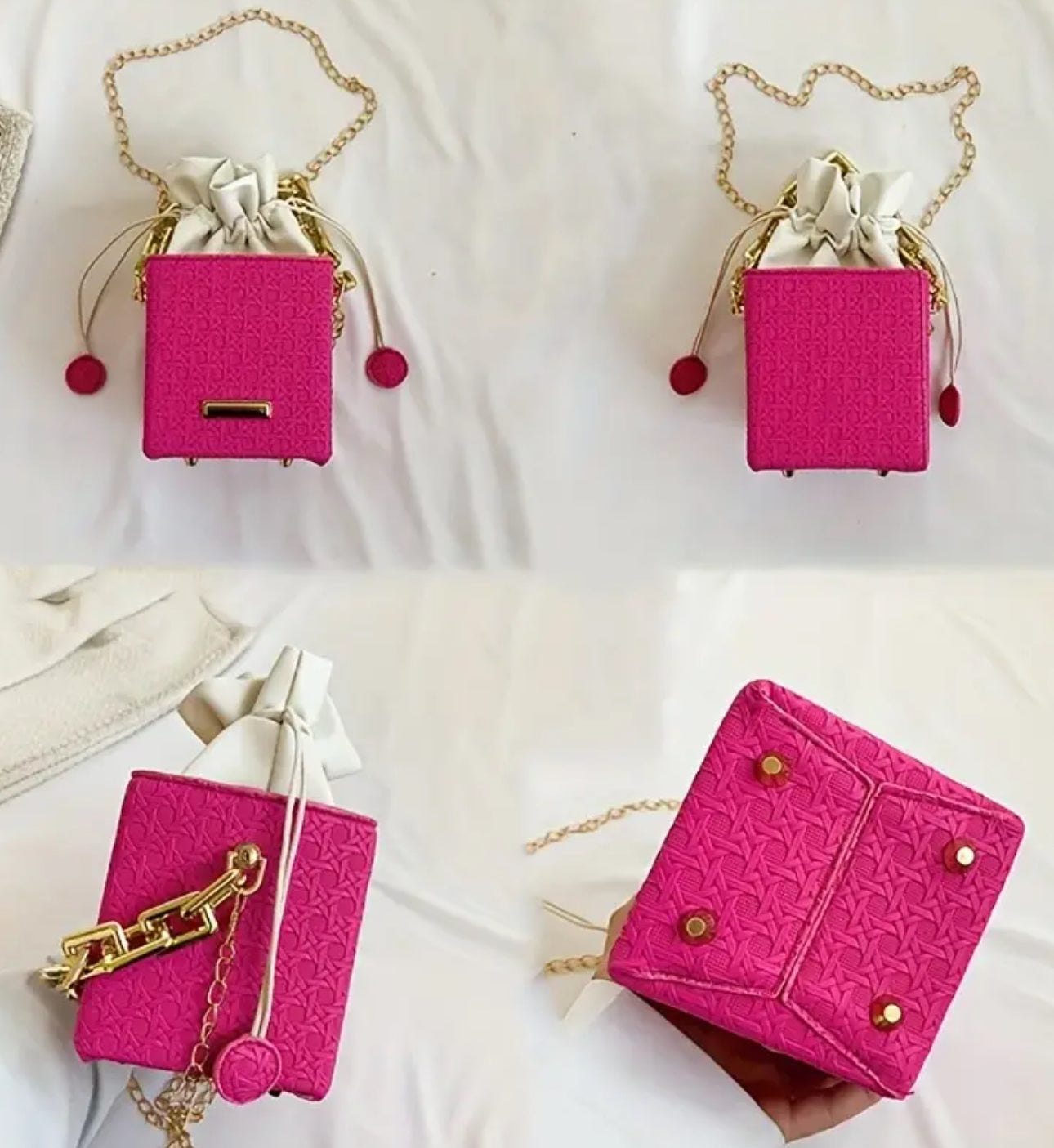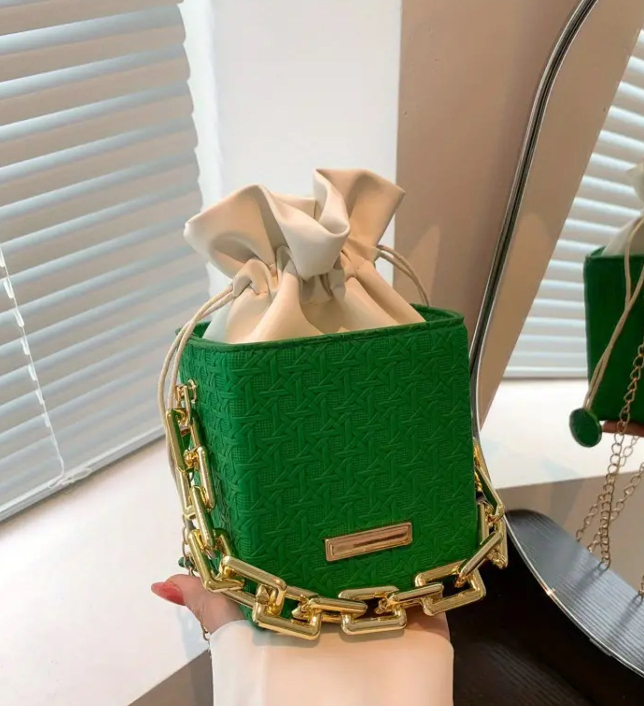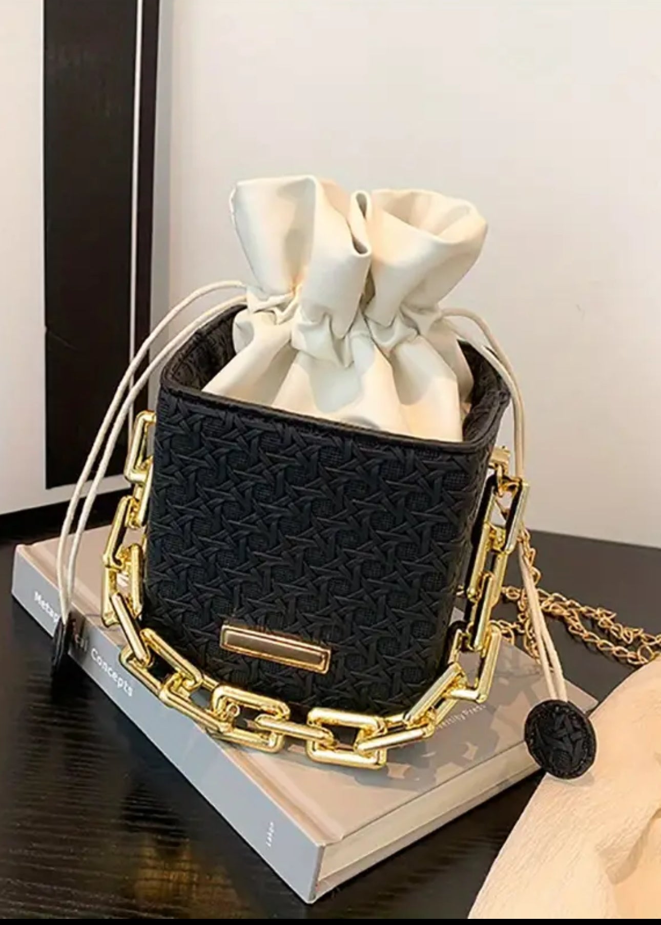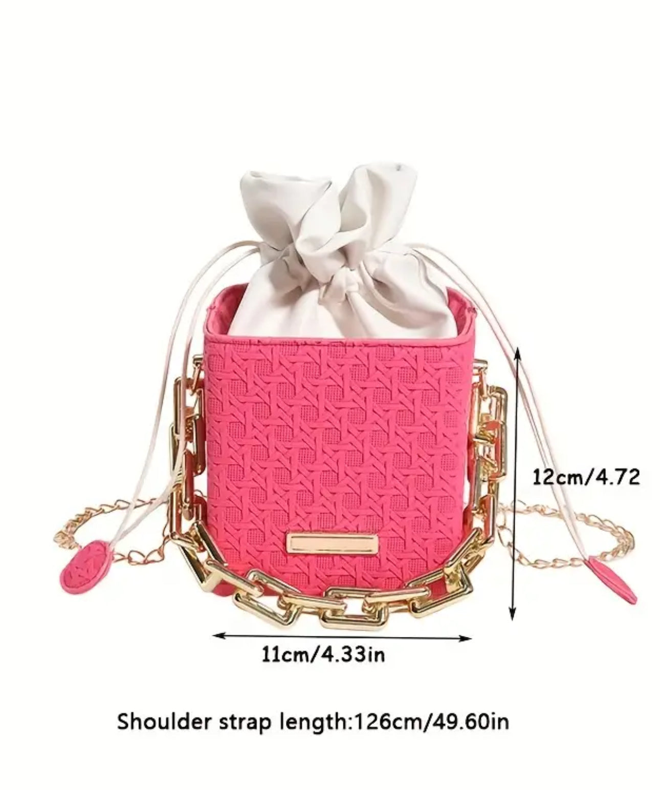 Crossbody Bucket Bag with Chain Strap and Drawstring Closure