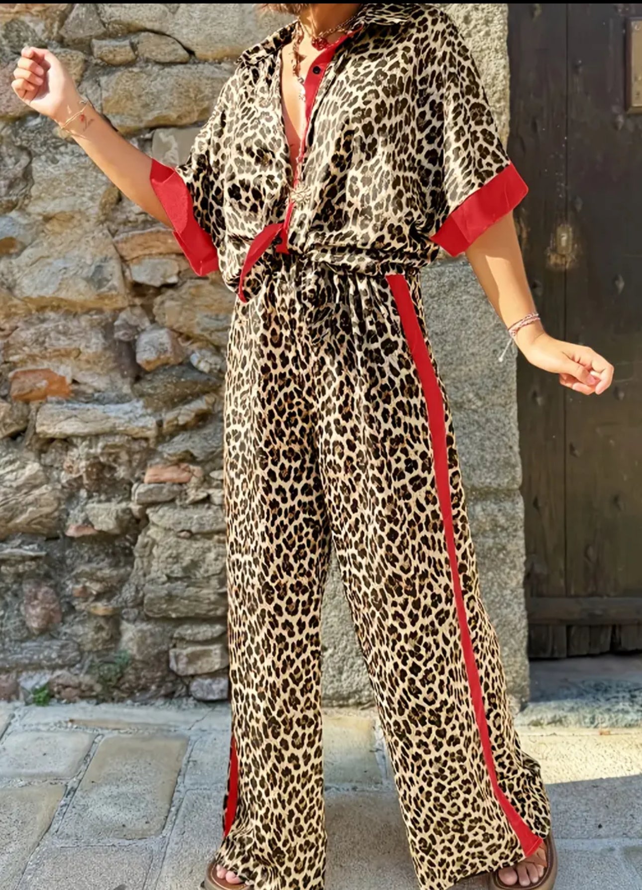 [2-Piece Leopard Print Suit] Elegant Leopard Print Contrast Short-Sleeved Shirt And Trousers Two Pieces Suit, Red Contrast Fashion, Casual And Vacation Suitable For Going Out