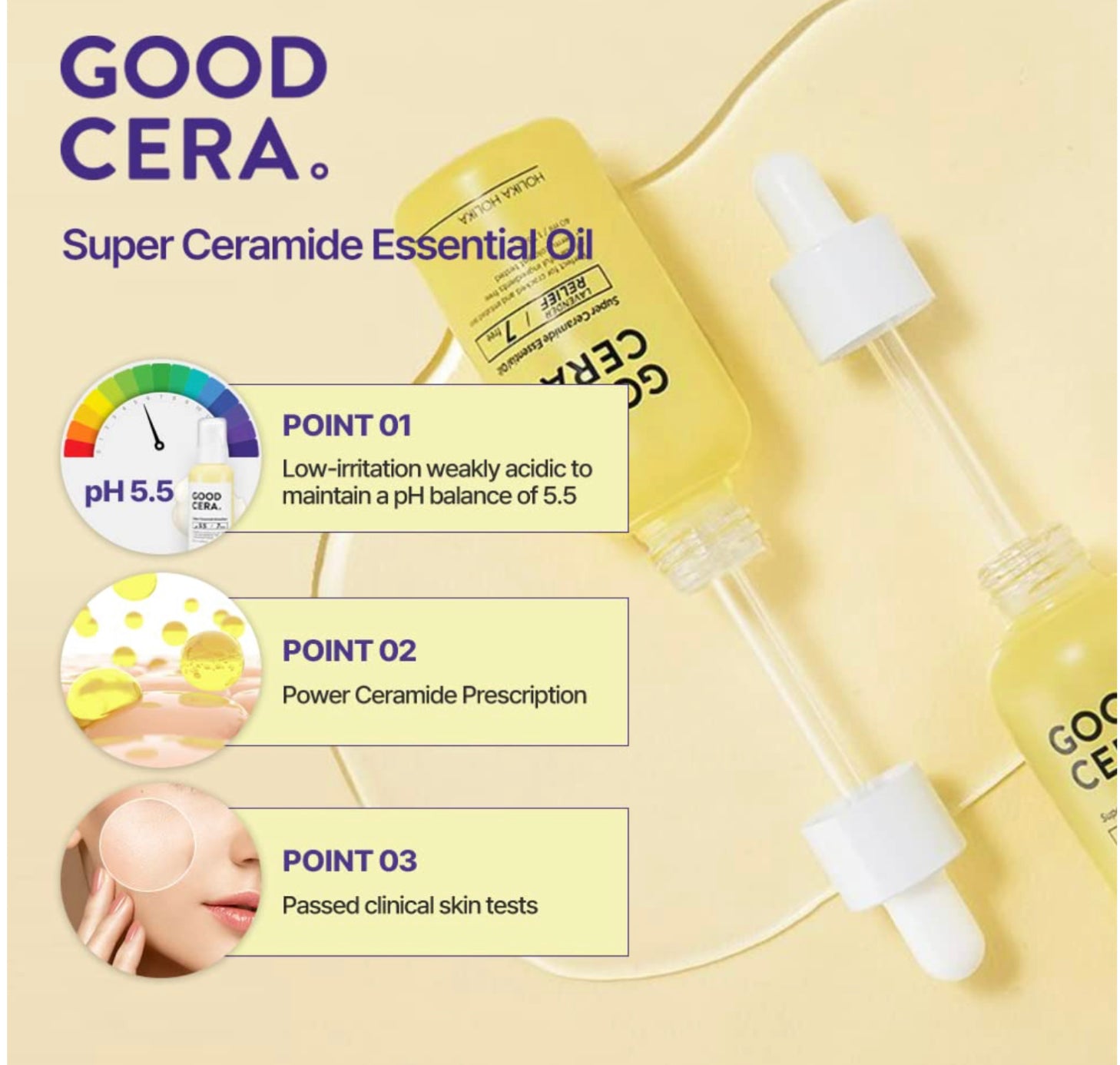Ultra-moisturizing essential oil that fortifies skin's barrier for healthy skin (good for face and body). Containing Ceramide and Arugula extracts: Making your skin healthier and moisture. Hypoallergenic cosmetics. Good to apply for all ages: Mild cosmetics. 10 Free: 10 kinds No additives.
