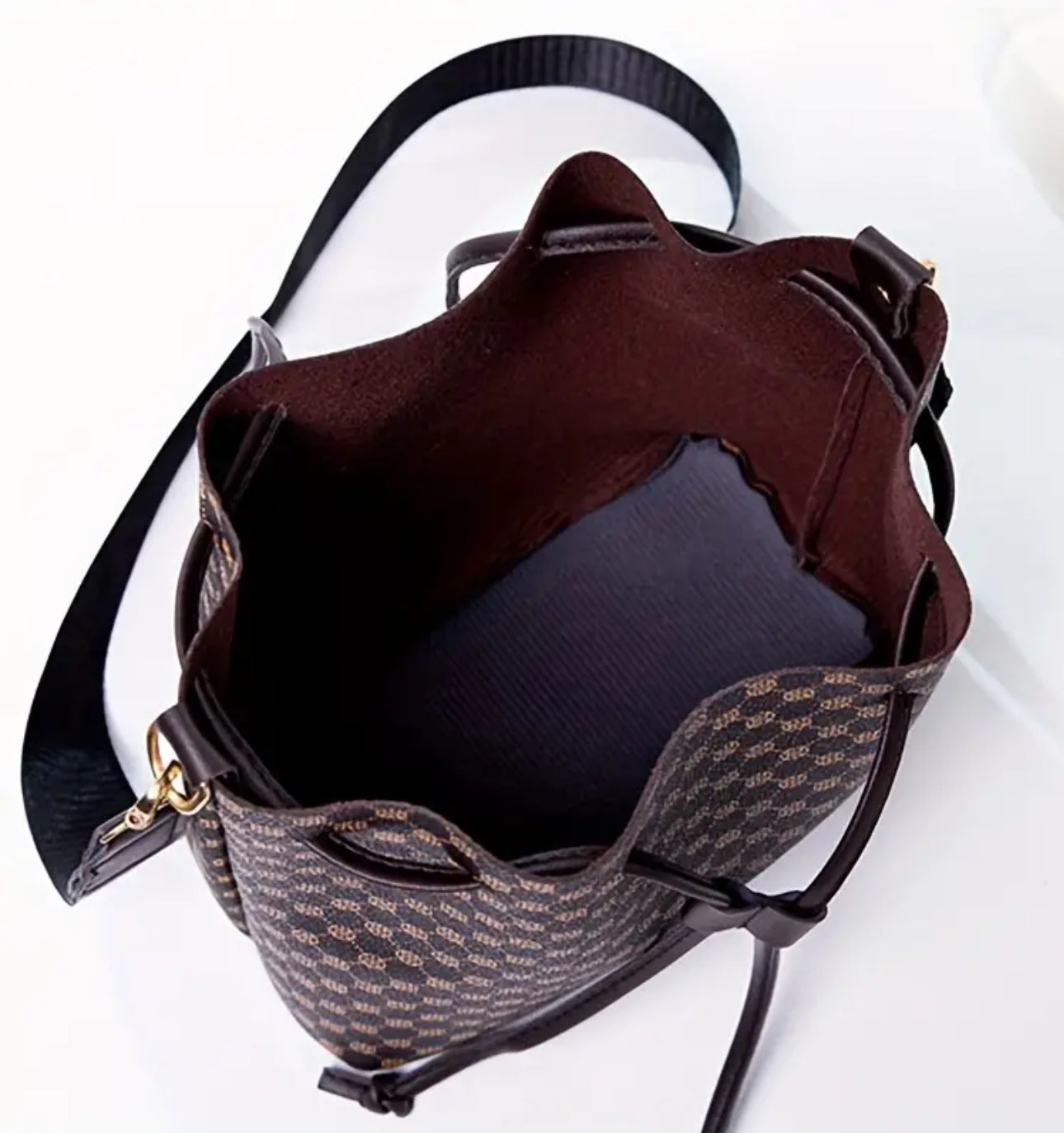 Fashion Printed Small Bucket Bag, PU Leather Shoulder Bag, Drawstring Strap Straddle Bag, Mini Tote Bag