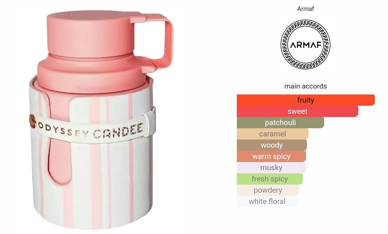 Odyssey Candee by Armaf is a fragrance for women. This is a new fragrance. Odyssey Candee was launched in 2024. Top notes are Strawberry, Raspberry, Geranium, Peach and Bergamot; middle notes are Caramel, Jasmine and Passionfruit; base notes are Patchouli, Musk and Amber
