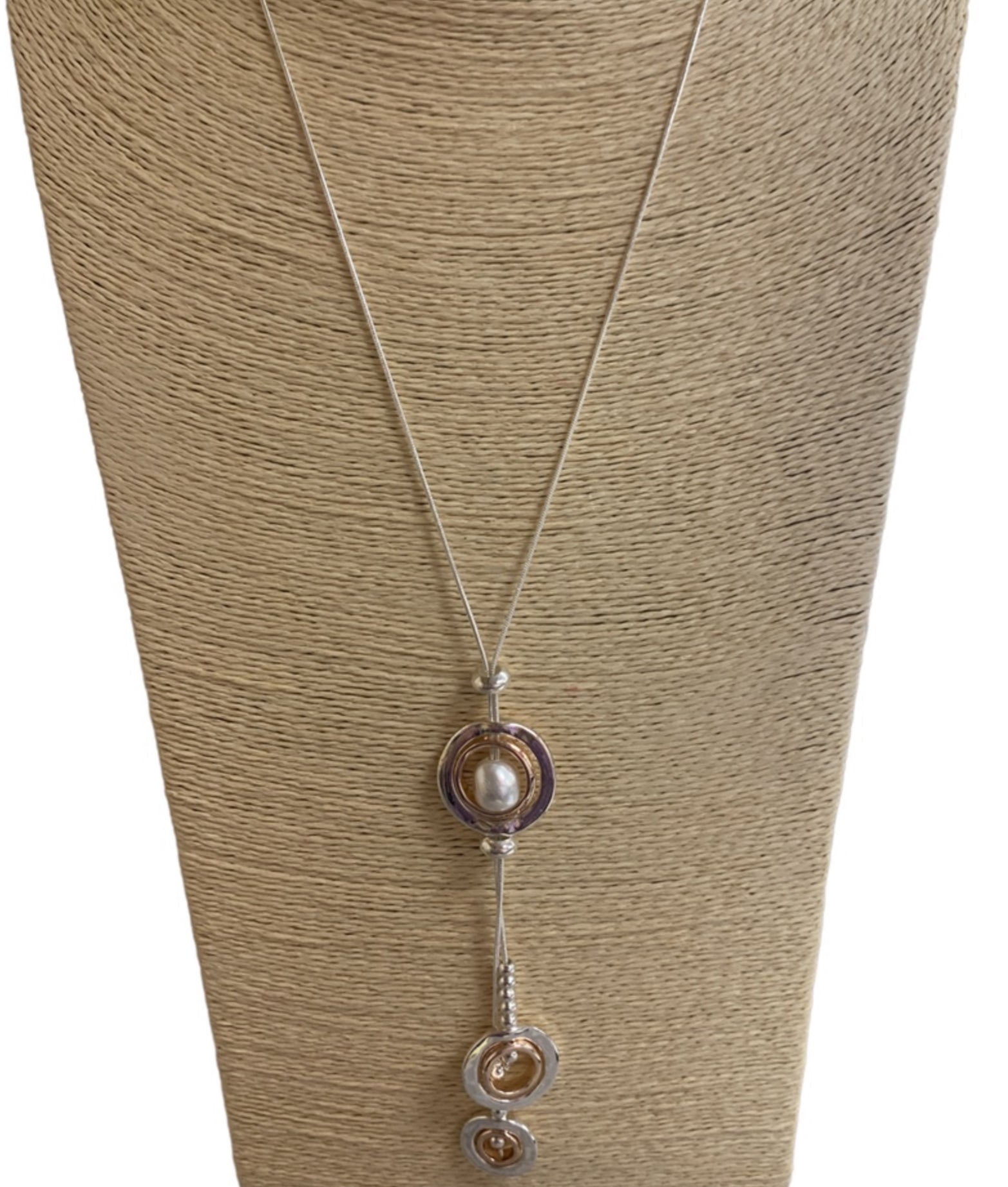 TWO TONE CIRCLE PEARL IN CENTER SNAKE CHAIN NECKLACE